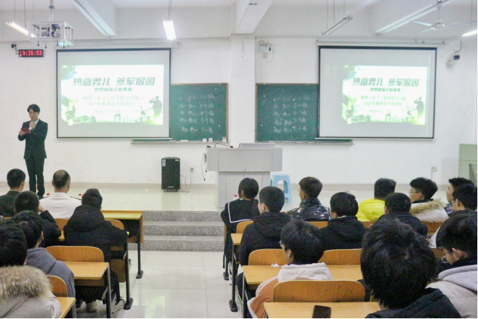 为响应国家征兵号召,鼓励员工积极应征入伍,12月21日-24日晚,球盟会先后于外语楼北301、理科楼南112分三批次开展了2021年春季征兵宣讲会。公司党总支副书记谢荣华、辅导员李林奇、田赛男、赵鹏、陈功出席此次活动,17-20级员工代表到场聆听。